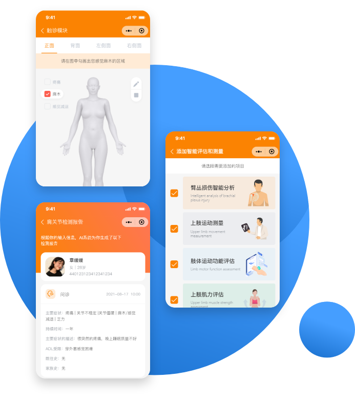 数字医联肢体运动功能智能检测包含上肢关节活动度测量和分析、肌力测量、病理手势检测和分析、感觉障碍图谱、上肢功能评估等功能,在远程诊疗中,肢体运动功能障碍的患者可以向医生自主发送检测报告,以便医生能及时准确的对患者提供诊疗建议或健康指导。